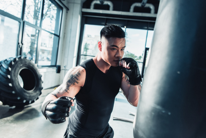 Выбрасывайте в мешок удары, а не самого себя. Стойте на обеих ногах и не заваливайтесь на мешок. Удержание баланса способствует более мощному удару и лучшей работе ног при движении вокруг мешка.