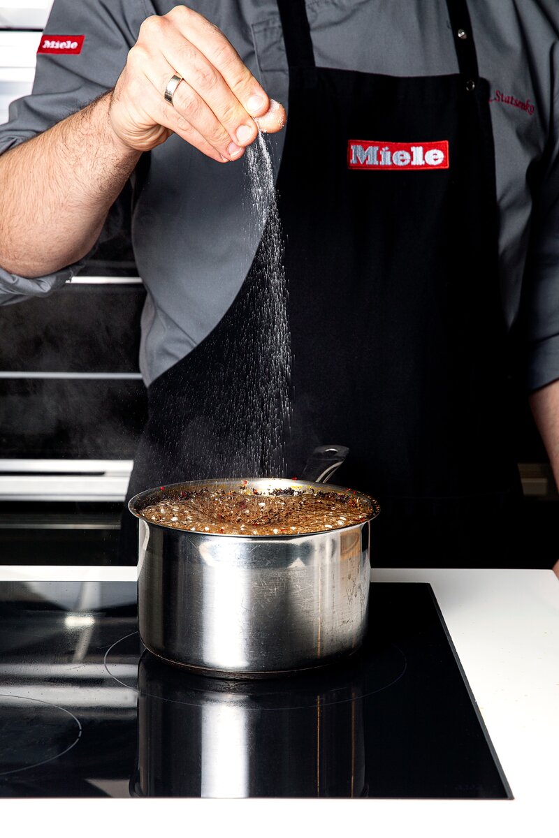 Haute Cuisine у вас дома? В преддверии, пожалуй, самого главного праздника россиян разбираемся, возможно ли это, – вместе с Miele и тремя известными московскими шеф-поварами Новый год – отличный повод на один день примерить на себя роль мишленовского повара и продемонстрировать гостям свой широкий гастрономический кругозор. Все мы знаем, для того чтобы произвести хорошее впечатление, важно все: ингредиенты, их сочетание, подача и изобретательность. В этом году мы постарались облегчить эту непростую задачу вместе с шеф-поварами Георгием Трояном («Северяне»), Русланом Поляковым (Remy Kitchen & Bakery) и Марком Стаценко («Milimon Family», телеведущий и амбассадор немецкого бренда бытовой техники премиум класса Miele). В преддверии новогодних праздников они поделились рецептами беспроигрышных блюд, способных удивить даже самого искушенного гостя вашего дома. Готовили, конечно, на Miele – совершенной, с точки зрения скорости внедрения мировых инноваций, технике. Марк Стаценко и корейка ягне