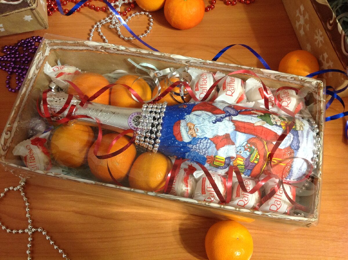 Осталось укомплектовать наш подарок. Подарочную коробку заполняем упаковочным наполнителем, а на него выкладываем всё остальное- шампанское, мандарины, конфеты, серпантин.
