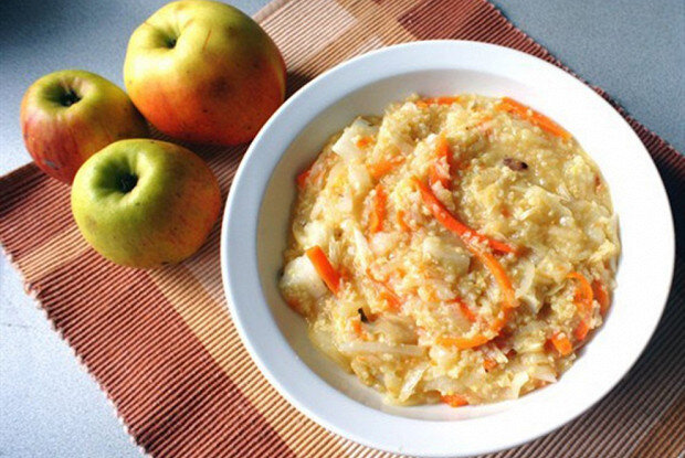 3. Тем временем, потушить на большом огне лук, морковь и чеснок, чуть позже кинуть немного репы (буквально четверть средней), через минут 5 кинуть квашеную капусту и убавить огонь. Как только картофель готов или на подходе, все смешать (морковь должна тушится минут 10–15). Добавить тертое кисло-сладкое яблоко и варить на медленном огне до готовности капусты.