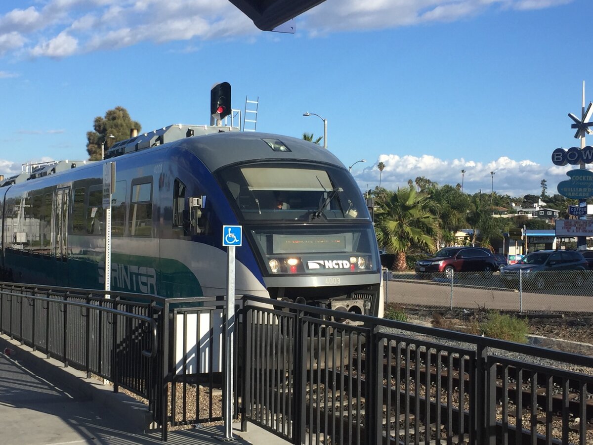 Калифорния - это место передовое во многом. Начиная от силиконовой долины и всемирной фабрики грёз, и заканчивая тем, что она одна одинешенька входит в первую десятку стран и регионов мира по уровню ВВП, хотя является не более чем одним из 50 штатов США. И вот именно в Калифорнии мне удалось познакомиться с одним из самых передовых видов городского общетранса. На самом деле мы уже привыкли к тому, что езда на общественном транспорте - будь то метро, автобус или трамвай - большое удовольствие доставляет очень редко. Но есть и исключения, когда наоборот, хочется продлить свою поездку. Особенно когда едешь не на обычном автобусе, а на каком-нибудь рельсовом транспорте. И особенно когда едешь в первый раз. Если катаешься каждый день на работу и с работы по 1,5-2 часа, то даже такой современный и удобный транспорт, как МЦК в Москве - может надоесть до тошноты. Итак, в 2008 году на севере каунти (района) Сан-Диего запустили скоростной междугородний трамвай-гибрид с приятным и понятным русско