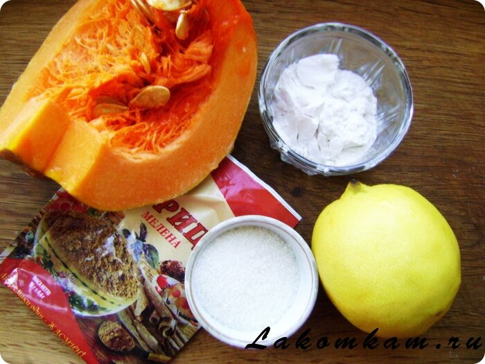 Ингредиенты: тыква — 350 грамм; лимон — 1 штука; крахмал — 1,5 столовые ложки; сахар (можно мед) — 3 столовые ложки; корица — 1 чайная ложка.