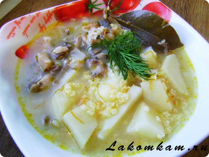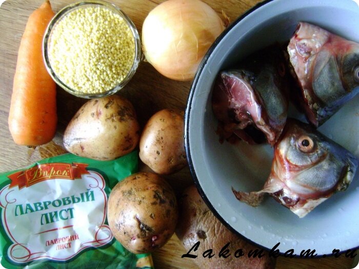 Ингредиенты: вода — 1,8 литра; рыбьи головы — 3 крупные; пшено — 100 грамм; картофелины — 3 штуки; луковица — 1 штука; морковка — 1 штука; лавровые листочки — 2 штуки; соль с перцем — по вкусу.