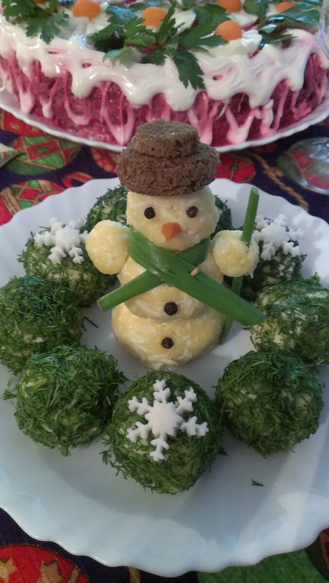 В предвкушении праздника хочу поделиться простым оформлением всем знакомой сырной закуски. В народе часто встречается под названием "Снежки" или "Сырные шарики". Готовится быстро, съедается ещё быстрее) Понадобится : 3 яйца сваренных вкрутую 200гр твёрдого сыра ( пармезан, маасдам, сваля или по Вашему желанию) 2зубчика чеснока Майонез. Сыр и яйца натереть на мелкой тёрке, чеснок пропустить через чеснокодавилку. Всё перемешать. Добавить немного майонеза. Скатать шарики. Снеговика собрала на зубочистку. Глаза, пуговицы- зёрна перца. Нос- морковка, шляпа-чёрный хлеб. Остальные шарики обваляла в рубленном свежем укропе. Снежинка из мастики, но об этом в следующий раз) На новогоднем столе смотрится очень празднично и интересно. ❄💥🎉 Всем приятного аппетита!