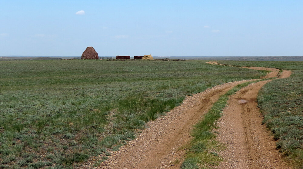 В полусотне километров от Жезказгана, в самом Сердце Степи, натурально посреди Великого Ничто, стоит древний мавзолей Домбаула. В прямой видимости от него - могила хана Джучи, а вот здесь чья могила - наука вряд ли когда-нибудь установит.