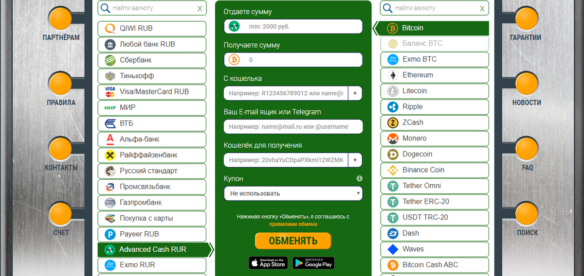 1. bankcomat.org Обменный сервис bankcomat.org предоставляет услуги по обмену электроных валют с февраля 2016 года. Гибкая система курсов и индивидуальное отношение к каждому клиенту. Зачастую курс не самый выгодный, зато надежность и сговорчивость поддержки на высоте! Огромный выбор направлений обмена. Почему советую данный сервис: 2. cryptobank24.me Онлайн-обменник создан в 2017 году, с этого года я его и использую.Обеспечивает быстрые, простые и безопасные операции с популярными платежными системами и криптовалютами. Пользуюсь им в основном для продажи криптовалюты с выводом на карту, отправляют после 1го подтверждения.Большой выбор направлений обмена. Информативный интерфейс.Сервис работает в следующих направлениях: Удобный и лаконичный интерфейс помогают сосредоточиться на обмене и не отвлекаться ни на что лишнее.Почему советю данный сервис: 3. 24paybank.com Работает также, как и предыдущие два 24/7, курс выгоднее чем у bankcomat.org Этим обменником пользуюсь также часто