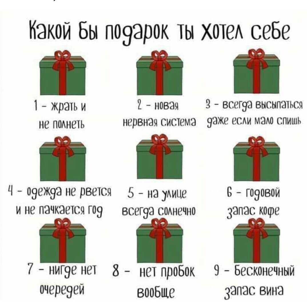 Новый Год - это прекрасный, добрый и волшебный праздник! На Новый Год люди всегда радуют друг друга подарками! Но ненужно забывать и о себе любимом! Какой подарок Вы бы хотели получить? Выбирайте... Выбирайте себе подарок, который больше всего Вам по душе! И С НОВЫМ ГОДОМ ДРУЗЬЯ!