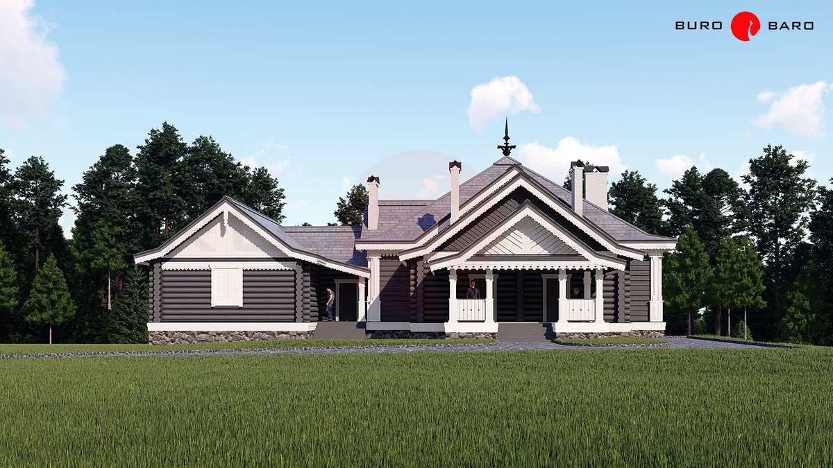 Баня, общей площадью 670 м2, расположена на сложном рельефе среди соснового леса. Выполнена в русском стиле, в несколько уровней. Стен 1-го этажа выполняются из сосны диаметром 250-300 мм. Рубка выполняется в ручную, "в обло". Главной задачей, кроме органично вписать в ландшафт было организация большого свободного пространства на 1-м этаже. Для этого была выбрана шатровая кровля, которая и продиктовала дальнейшие архитектурные особенности. Это пространство не просто разделено перегородками, а в нем будут выстроены отдельные "домики" над душевыми, хамам и сауной. Когда выходим из раздевалки попадем не просто в большое помещение, а в уютную закрытую среду. На цокольном этаже располагаются номера, бильярдная и массажные.