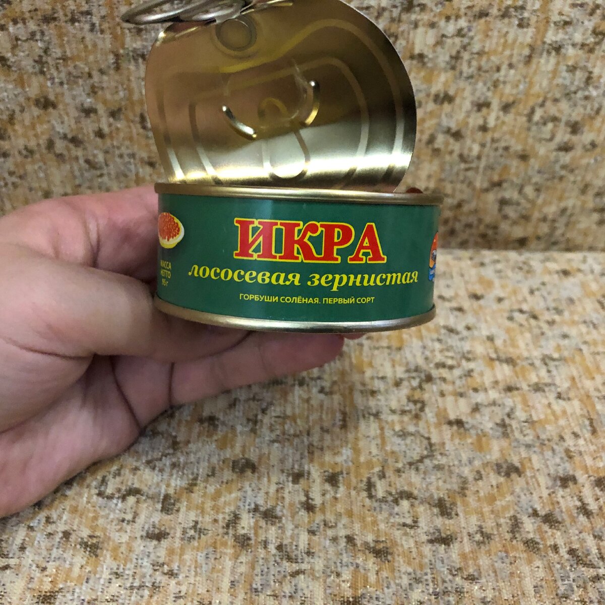 Купила красную икру у тетки на рынке за 150 рублей за банку. Показываю, что внутри