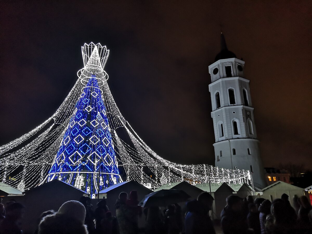 А вот и лучшая елка европы 2019! В этом году признали самой-самой древо Вильнюса. Многочисленные гирлянды и лампочки и своеобразный шлейф, раскинувшийся над ярморочными домиками. Стилистика украшений самой ёлки и ярмарки - шахматы. Вокруг дерева есть специальные подиумы для более удачных снимков. Вечером на кафедральном соборе Святого Станислава почти каждый час показывают сказку Снежная королева. Симпатично и очень громко😁 Во время представления, елка и все гирлянды вокруг, гаснут. Но есть и огромные минусы, портящие общее впечатление. Маленькое количество ярмарочных домиков и неудобное их расположение. Всё киоски стоят вокруг ёлки кругом с 4 или 5 выходами из центра. В итоге вечером, когда основная толпа желает погулять, покушать и выпить горячего глинтвейна, внутри ёлки сумасшедшее столпотворение. Зайти или выйти в круговорот посетителей очень сложно. Очереди за напитками и едой огромные.🤦 Расположение "солнышком" домиков было бы более оптимальным и минимизировало большие вечер
