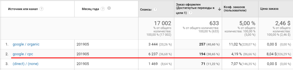 Со всех источников реклама приносила примерно 31% от всех заказов. 40% заказов приходилось на органику. Также коэффициент заказов из рекламы был ниже, чем из органики. В принципе это стандартная ситуация при хорошей SEO.