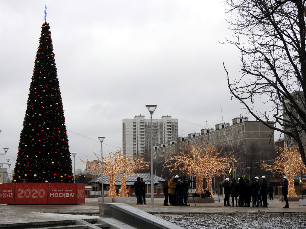 Самого блестящего заммэра заснять толком не удалось, хотя он давал интервью на фоне меня. А у меня с собой ни пистолета, ни ножа, ничего... Акулята пера, прикормленные московскими властями. Смотрите в новостях, чего он там наболтал. Вроде бы 9 станций в 2020 году обещал (помимо нашей ветки от «Косино» до «Рубцовской/Электрозаводской» еще и какие-то «Улица Народного Ополчения» и «Карамышевская»). Предполагаю, что Хуснуллин приехал именно сюда, потому что тут почти все готово уже. Это всякие «Нижегородские» отстают. Мода этого года в украшении городских улиц на Новый год — светящиеся деревья. Везде их наставили. Выхино и его жители уверенно смотрят в 20