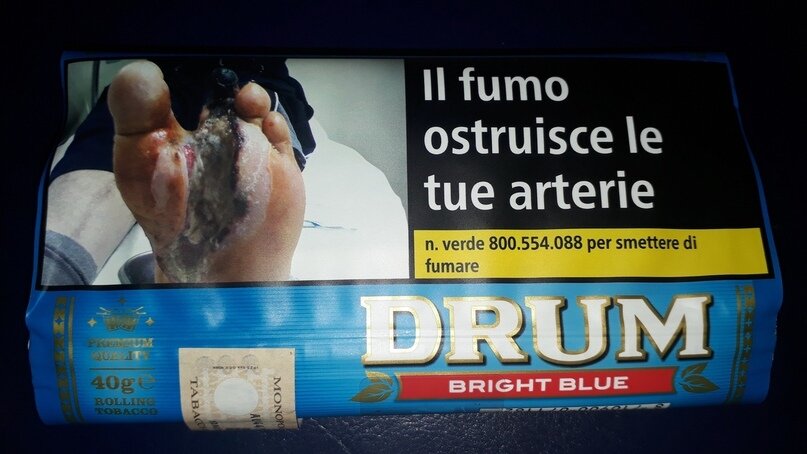 Сегодня на обзоре табак Drum Bright Blue, был куплен в Италии за 7 Евро, вес кисета 40 гр. Так как кисет для внутреннего рынка Европы, он изуродован картинками, где изображены случаи пренебрежением техникой безопасности на высоковольтных линиях в Альпах.