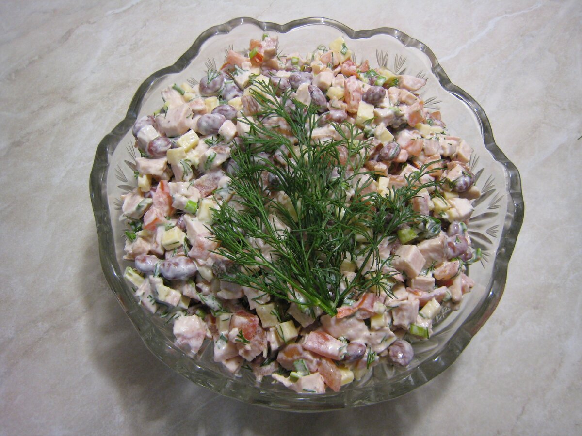 Приветствую вас, уважаемые подписчики и гости моего канала. Хочу предложить вашему вниманию рецепт салата, который готовится очень быстро, состоит из обычных продуктов, без изысков, но, тем не менее всегда получается вкусным и довольно сытным. Время его приготовления составляет не более 15 минут, так что включаем таймер и поехали... Для приготовления нам понадобится: граммов 400 копчёной куриной грудки, 150 граммов сыра, по небольшому пучку зелёного лука и укропа, два помидора, банка консервированной фасоли, две столовые ложки майонеза, соль и перец по вкусу. Помидоры и зелень моем, с фасоли сливаем сок. Мясо, сыр и помидоры режем небольшими кубиками, зелень мелко рубим. Помидоры можно откинуть на дуршлаг, чтобы стекла лишняя жидкость. В подходящую для смешивания всех ингредиентов посуду помещаем измельчённую куриную грудку. Кладём к мясу сыр. Всыпаем фасоль. Добавляем помидоры. И рубленую зелень. Перемешиваем, солим и перчим по вкусу. С солью рекомендую быть осторожными, потому что ко