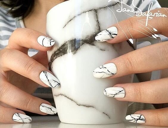 Техника росписи на ногтях, “под мрамор”, пользуется очень большой популярность. Причем выполняют такую технику, как на всех пальцах, так и на одном или нескольких. Оставшиеся ноготочки остаются однотонными. Смотрится очень эффектно, живо. Но при этом не сильно броско и ярко. Идеи мраморного маникюра, можно назвать “золотой серединой”, между нежностью и эффектностью. Читайте также: Благородство изумрудного маникюра Какой цвет выбрать Как ни странно, но бело-черный “мрамор”, гармонично смотрится с однотонными розовыми, серыми ноготочками. Не мешает и присутствие блестящих акцентов в тандеме с “мрамором”. Наверное, технику “под мрамор”, кроме того, что “золотой серединой”, можно еще и назвать универсальной. Такой тип маникюра будет уместен везде. Как в будничном офисе, так и на яркой вечеринке. В целом очень “удобная” и интересная техника в маникюре. Читайте также: Идеи элегантного матового маникюра Читайте также: Вишневые оттенки в маникюре Идеи мраморного маникюра Специально для вас,