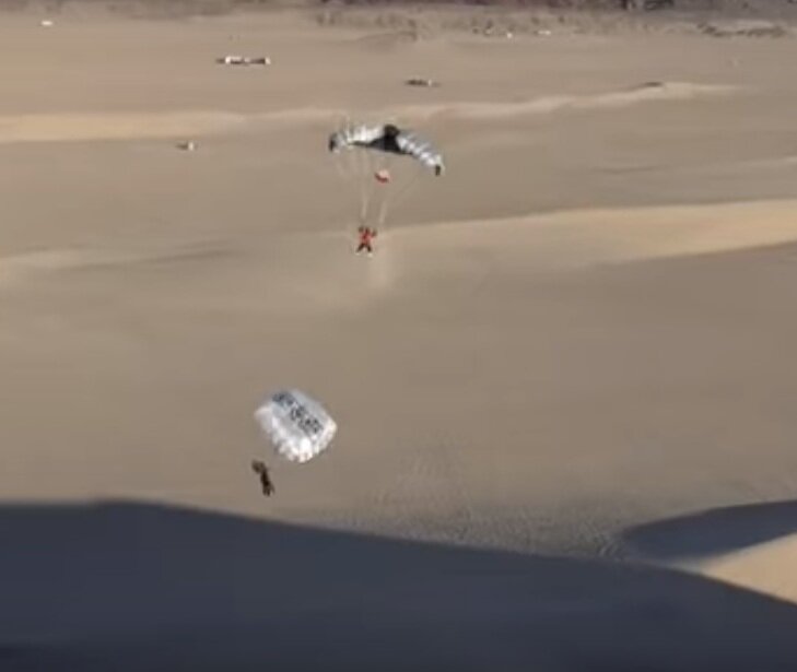 Прыжок через гигатскую дюну на мотоцикле с парашютом. Бейсджамп теперь еще опаснее!