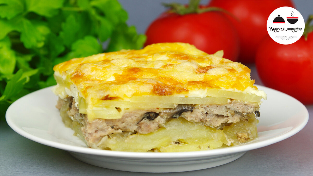 Все сложил, залил - и в духовку! Добавьте в праздничное меню - всем понравится! Готовится очень просто, получается очень вкусно. Еще никто не отказался от добавки! Моно подать в качестве горячего на новогодний стол! Мясной фарш (мясо можно взять любое) смешиваю с нарезанными грибами. добавляю соль и перец. Перемешиваю. Форму смазываю маслом. Выкладываю слой картофеля. Картофель я обычно тонко нарезаю. И он успевает приготовиться. Но можно предварительно уже нарезанный картофель опустить в кипящую воду на несколько минут - тогда блюдо приготовится быстрее. Картофель солю. Выкладываю на него нарезанный полукольцами лук. И фарш с грибами. Посыпаю сыром. И снова картофель. Сверху картофель снова немного солю. Готовлю заливку. Взбиваю яйцо, добавляю сметану, соль, перец и чеснок через пресс. Перемешиваю. Заливаю блюдо сверху и ставлю в духовку, разогретую до 180 градусов на 40 минут. Затем посыпаю натертым сыром и готовлю еще 10-15 минут. Нарезаю и подаю. ИНГРЕДИЕНТЫ: • Картофель - 800 г •