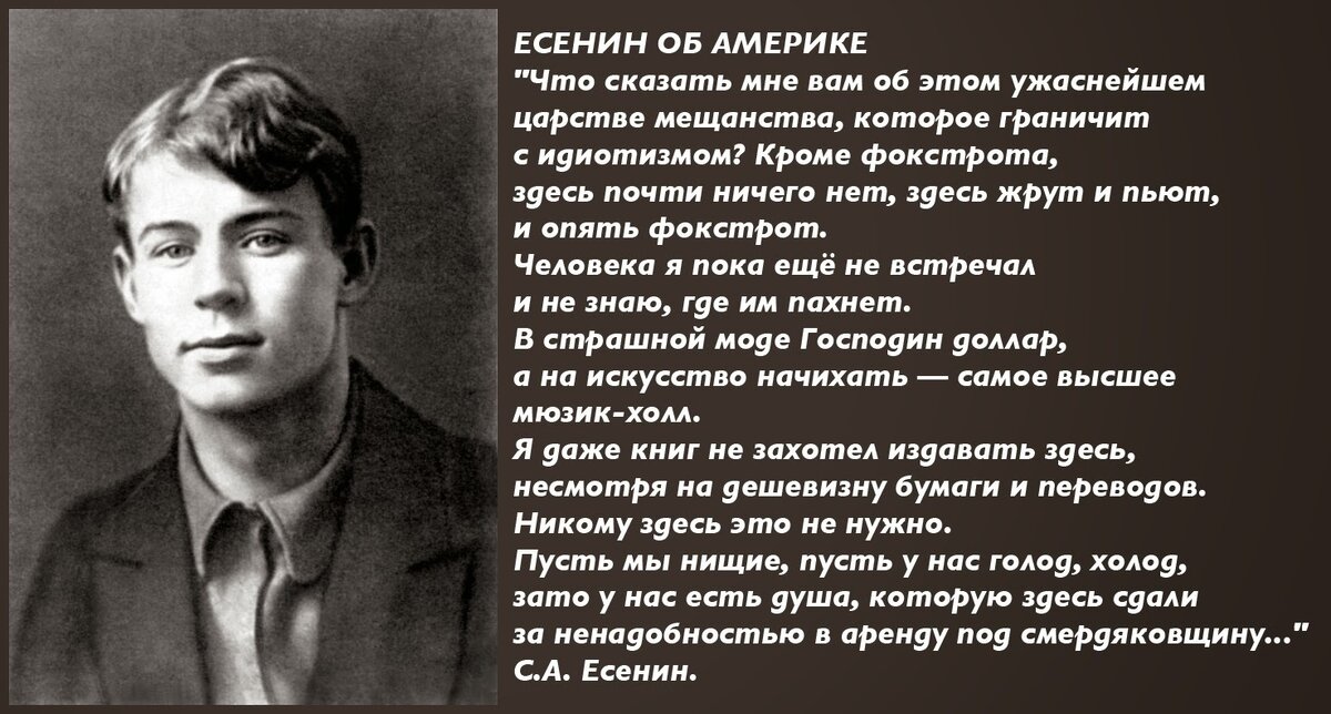 У каждого свои взгляды на политику Соединённых Штатов. Для кого-то она жестока, для кого-то идеальна, а для кого-то полна минусов и несправедливости. У Сергея Есенина тоже была своя позиция по этому поводу, и звучит она так: *Фокстрот - танец, который был особо популярен в США, особенно в 1920-1940 годы. Самое интересное это то, что Есенин говорит правду и о России: "Мы нищие... у нас голод, холод". Взгляды поэта ясны: ему не нравится происходящее в этих двух державах. Но вот отрывок из его стихотворения "Места нет здесь мечтам и химерам...": Эти люди – гнилая рыба,
