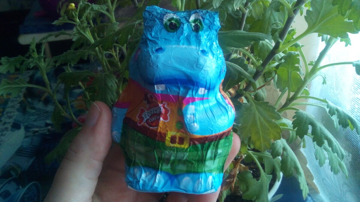Добрый день! Дорогие друзья! Поздравляю вас с наступившим Новым годом и приближающимся Рождеством! За несколько дней до Нового года я отправилась за покупками, планировала собрать для дочки хороший, вкусный сладкий подарок. Заглянула в Пятерочку, набрала там всяких конфет и уже на кассе заметила необычные шоколадные фигурки Детский сувенир. Один такой бегемотик стоил по акции всего 44,99 рублей, поэтому, было решено купить сразу два и положить их к сладкому подарку. Итак, Новый год наступил, подарок подарен дочке, она принялась с интересом перебирать его содержимое. Естественно, практически сразу она обратила внимание на этих бегемотов. Было решено открывать их первыми, а я заодно приготовила телефон, чтобы отснять процесс распаковки. Именно им я сегодня с вами и поделюсь. Изготовлен этот бегемотик фабрикой Славянка, под брендом Детский сувенир. Масса: 44,50 грамм. Вся информация об этом бегемотике была указана на самой фольге, кроме того, и на ногах фигурки я обнаружила бумажку, на к