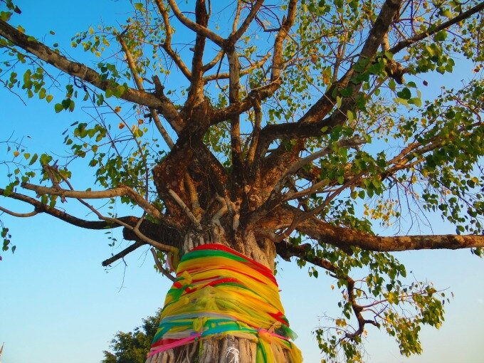 Прогуливаясь по местным улицам Таиланда любого региона ,будь то Бангкок или какой-то из островов, можно заметить ленты на деревьях, иногда даже подношения в виде угощений или статуэток рядом с этими деревьями Как думаете, зачем? Оказывается, что деревья с ленточками – это “домики духов” (spirit trees). Тайские жители верят, что в деревьях живут духи. Особо старые и большие деревья, а значит и духи там особо старые и сильные, обвязывают разноцветными полосками ткани и приносят подношения, для того чтобы умилостивить духов. Тайцы верят, что в разных видах деревьев живут разные виды духов. Самыми популярными – по неизвестным мне причинам – являются Nang Tani и Nang Takian. Какие же они? Мы нашли про два вида духов, точнее про два вида самых часто встречаемых духов. Знакомьтесь, это Nang Takian живут в хопеях – деревья такие (Hopea). Это что-то (или кто-то) вроде лесных нимф. Являются обычно в виде прекрасных тайских дев в национальных костюмах. Вроде как, безопасны и дружелюбны. А вот
