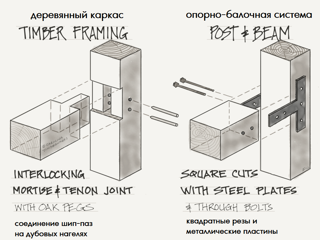 Timber frame Плюсы деревянного каркаса - timber frame Недостатки деревянного каркасного строительства -timber frame Post and beam Плюсы опорно-балочной конструкции - post and beam Минусы опорно-балочной конструкции конструкции - post and beam металл и дерево, как правило, со временем хуже держат связь. Информация переведена и подготовлена на основе статьи с сайта Carolina Timberworks. Подписывайтесь на наш канал, ставьте лайки