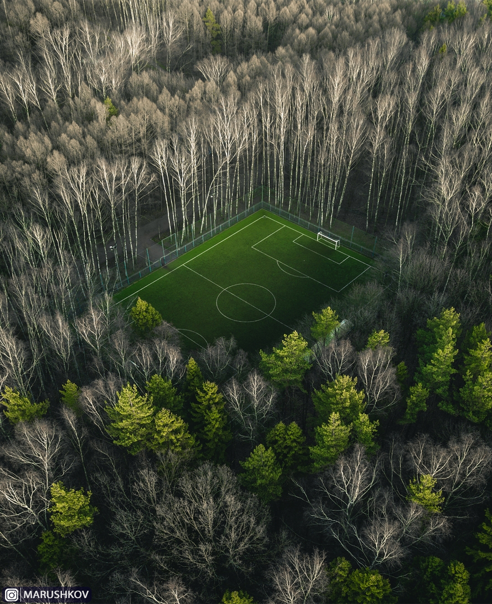 Москва, Парк Мещерский. Именно тут, посреди лесных пейзажей и свежего воздуха, расположилось небезызвестное футбольное поле. Это поле имеет искусственное покрытие из материала последнего поколения и наполнителем из кокосовой стружки. Кстати, оно соответствует требованиям ФИФА. Площадка оборудована небольшой трибуной, которая может принять до 50 человек. Размеры самого поля составляют 60х40 метров. Имеется освещение, но отсутствуют раздевалки и душевые. С 8 часов утра и до 16:00 стадион находится в свободном доступе. А вот уже с 16:00 и до 23:00 придётся заплатить, чтобы поиграть там в футбол. Полчаса игры вам обойдутся в 1250 рублей. Для полноты картины и расширения кругозора, предлагаю посмотреть какие футбольные поля можно встретить в разных уголках нашей планеты: • Футбольные поля в необычных локациях (коллекция первая) • Футбольные поля в необычных локациях (коллекция вторая)