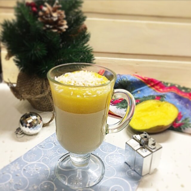 В новогодние праздники идеальный десерт для всей семьи! Ингредиенты на 2 порции: Манго-1 шт Сироп/сахарная пудра-1 ч л Сок лимонный (в кокосовое молоко-1 ст л, в манго-1 ст л) Сахар/сироп-2 ст л Агар-агар-1,5 гр ( чайная ложка без горки) Молоко коровье/кокосовое-200 мл Вода-50 мл Кокосовая стружка для украшения Приготовление: Агар-агар замочить в воде (50 мл) до набухания. В кокосовое/коровье молоко добавить сахар/сироп. Довести до кипения, добавить агар-агар, перемешать, варить 2-3 минуты, снять с огня. Немного остудить и влить лимонный сок ( только если молоко кокосовое) Разлить по формам, полностью остудить, затем убрать в холодильник. Манго пюрировать с помощью блендера с сиропом/сахарной пудрой и лимонным соком. Выложить манго в формы с панна коттой. Посыпать кокосовой стружкой. Приятного аппетита!