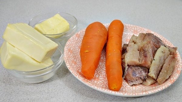 В преддверии Нового года хозяйки часто ломают голову над тем, что приготовить на праздничный стол. Многие хотят приготовить что-нибудь новенькое, чтобы удивить гостей своим кулинарным талантом. В интернете полно рецептов блюд из разнообразных заморских продуктов. Но, к сожалению, не всегда есть возможность и средства для покупки экзотической еды. Я предлагаю вам приготовить простую, но в тоже время бомбически вкусную закуску всего из 4 ингредиентов. Продукты для данного рецепта стоят недорого и их можно найти практически в любом магазине. Для приготовления ложной икры нам понадобится: 1. Сначала подготовим ингредиенты. Для этого отварите морковь. Сельдь почистите и избавьте от костей. Вместо целой селедки в блюдо можно добавить уже готовое филе. Сырки я использую "Дружбу" в небольших пачках по 90 гр. 2. Соберите мясорубку и пропустите через нее все ингредиенты. 3. Прокручивайте продукты по очереди. Напоследок оставьте морковь. Она отлично подтолкнет ингредиенты. Для измельченных пр
