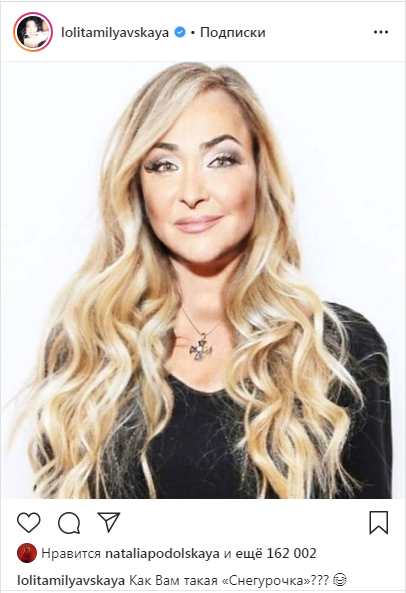 Недавно эпатажная певица опубликовала в своем профиле забавную фотографию, на которой предстала в совершенно непривычном образе, окрестив себя "Снегурочкой" На этом фото беловолосая дама взирает на нас из-под пышных ресниц, раскинутых на фоне серебристо-серых теней, растянутых до самых надбровных дуг. А на ее лице играет ухмылка, контрастирующая со сверкающим коричневым румянцем. Но не пугайтесь, звезда не меняла свой образ накануне праздника. В своем комментарии она дала подробное объяснение. Оказывается данную фотографию Лолита нашла на просторах интернета и решила поделиться ей со своей публикой. Так же певица предупредила, что не готова к таким кардинальным переменам. А вот ее коллегам по сцене, преображение звезды очень даже понравилось. Многие эстрадные артисты поспешили расхвалить Милявскую, и отметить каким нежным получился образ. А как Вы считаете, стоит ли Лолите сменить свой привычный черный на сверкающий блонд?