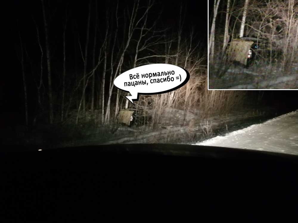 Вчера возвращался с Хабаровска домой. Ночь, тишина, редкие встречные фары машин, как ни как 4 ночи или утра, кому как нравится. И вот оно, как то странно раскидан щебень с обочины. Первое что пришло в голову: кто то ковшом (кто чистил трассу от снега), зацепил обочину и выкинул камни на дорогу. Но как-то они очень странно лежали. Сразу после этого заметил краем глаза какой то свет в темноте в лесу и силуэт напоминающий избушку в глухом лесу, по ходу я сказок всё таки перечитал. Оттормозился, развернулся и встал так что бы можно было осветить что то там не понятное для себя. Как вы думаете, что я там нашёл ? Да, да. Парень приспустил боковое стекло и произнёс ту самую фразу, от которой мы ржали наверное ещё минут 30 после того как отъехали от них: Пацаны, всё нормально, спасибо что остановились. Всё нормально - повторил он ещё пару раз. Честно говоря, осмотрев место, я немного канул в ступор. Деревья, и кустарники не сломаны. Такое ощущение что краном её туда поместили, иначе не сказат