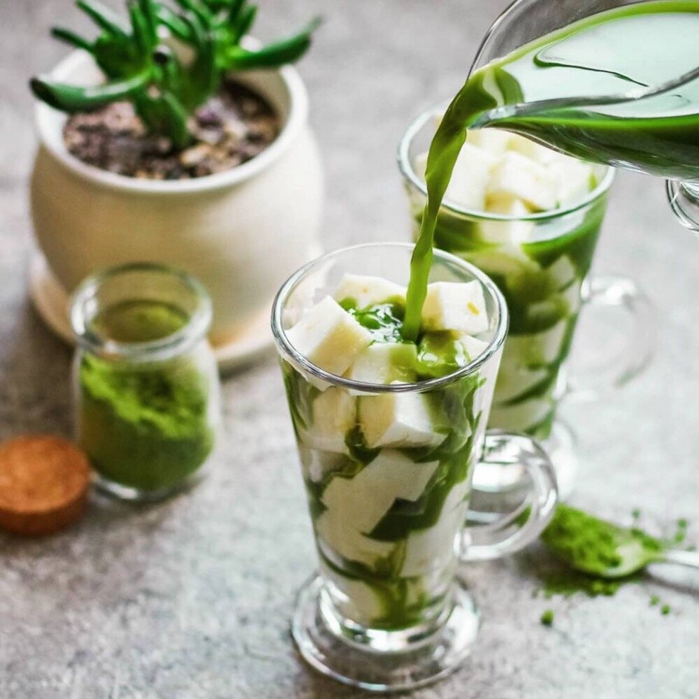Кухня: Европейская Время приготовления: 30-60 минут Ингредиенты: Желе: Натуральный йогурт - 300г Молоко - 300г (в равных пропорциях с йогуртом) Желатин - 30г Сахара - от 1/2 стакана до 1 стакана (по вкусу) Лимонный сок - 25мл Сироп: Японская пудра матча - 2 ч.л Сахар - 1/2 стакана Соль - щепотка Инструкция по приготовлению: 1. Молоко и йогурт должны быть комнатной температуры. Желатин залить холодной водой, оставить на 20 мин в жаропрочной посуде. тем временем в глубокой миске смешать венчиком йогурт, молоко, сахар, сок и цедру. 2. В кастрюлю с горячей водой поставить посуду с желатином и мешать до его растворения. (или прогреть его в микроволновке 30 секунд) Тонкой струйкой влить желатин в молочно-йогуртовую смесь, постоянно размешивая быстрыми движениями. Вылить в прямоугольную форму, охладить и поставить в холодильник ~ 4 ч. 3. Сахар и соль залить 1 стаканом горячей воды, размешать до полного растворения. Остудить. Порошковый чай залить 4 ч.л. горячей воды, смешать до однородной пас