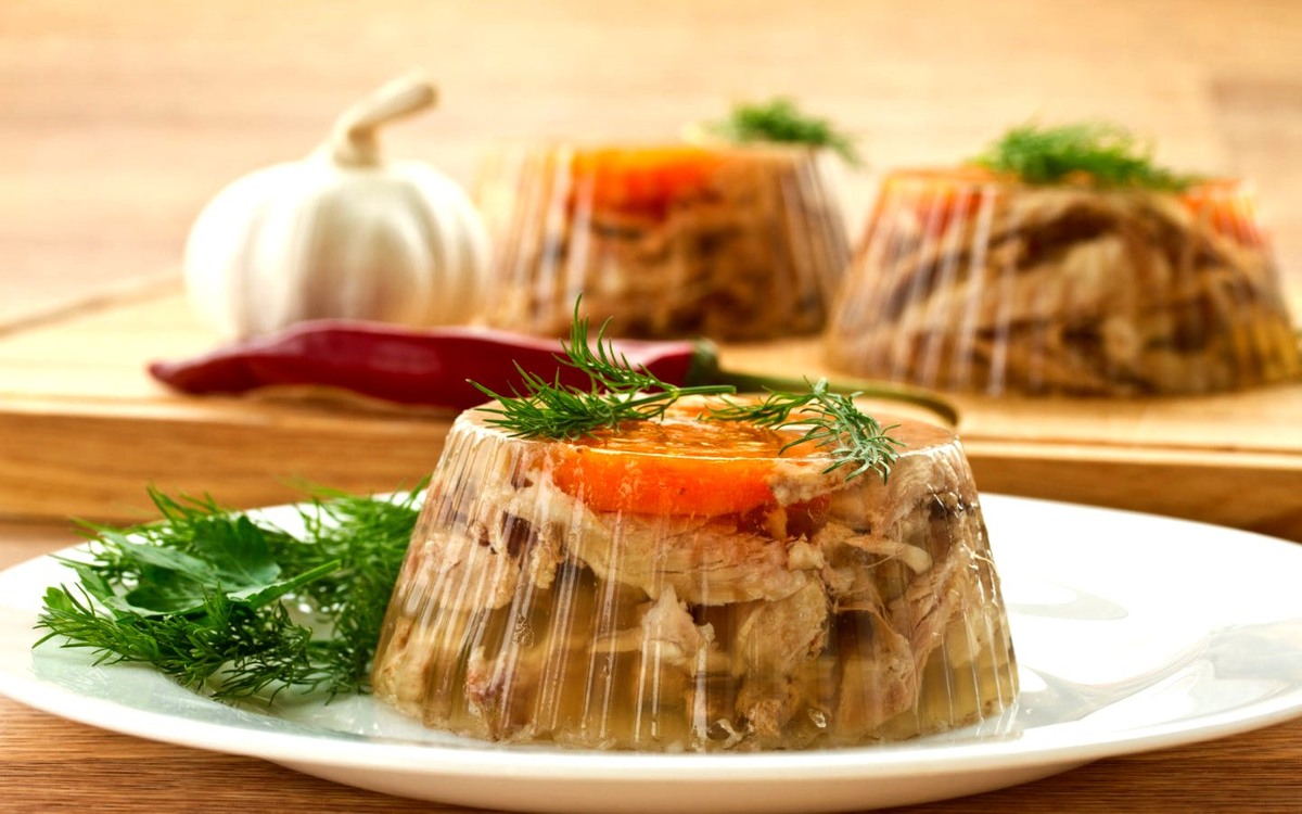 ХОЛОДЕЦ (Вариант 1) Продукты: Приготовление: Разрубить свиные и телячьи ножки на несколько частей. Варит ножки, мясо, овощи, лавровый лист, перец горошком, специи, чеснок в воде (влить воды столько, чтобы она только прикрыла содержимое кастрюли) в течение 2 часов на слабом огне. Снять накипь, посолить по вкусу, добавить петрушку, уксус и варить еще 2 часа. Процедить бульон, отставить в сторону. Вынуть из бульона ноги и морковь. Выбросить лук и специи. Порезать мясо и морковь ломтиками и разложить их на дно формы для студня, добавить петрушку и залить бульоном. Остудить в течение 4 часов. Аккуратно снять жир. Подавать с ломтиками лимона и рубленой петрушкой. ХОЛОДЕЦ (Вариант 2) Продукты: Приготовление: Промыть и подготовить необходимые мясные продукты, при необходимости разрубить, положить в большую кастрюлю, залить водой на 2 см выше уровня мяса. Дать закипеть, поставить на очень слабый огонь и варить под крышкой 5 часов. Через 5 часов в холодец, не снимая его с огня, добавить цел