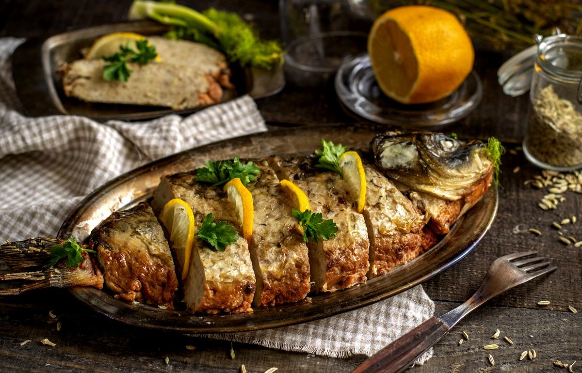 МАРИНОВАННЫЙ КАРП В ЖЕЛЕ Продукты: Приготовление: Очищенную рыбу нарезать небольшими порциями. Кружочки лука, морковь, петрушку залить 2 л воды и варить на слабом огне 15—20 мин. Затем влить уксус, вино, положить рыбу, лавровый лист, перец, посолить, добавить сахар и варить на слабом огне 1 час. Маринад процедить и растворить в нем желатин. На дно формочек или чашек положить звездочки, вырезанные из моркови, листочки петрушки, кусочки рыбы без костей, лук и залить маринадом. Поставить в холодное место. Перед подачей на стол осторожно обвести каждую порцию у краев ножом и, опрокинув формочки, выложить рыбу с желе на круглое блюдо. Украсить зеленью петрушки и фигурно нарезанным лимоном. РЫБА, ЗАПЕЧЕННАЯ «ПОД ШУБОЙ» Продукты: Для «шубы»: Для бульона: Приготовление бульона: рыбу (лучше всего карпа) очистить, выпотрошить, отрезать голову, хорошо вымыть, удалить кости, посолить и оставить на 2 часа. Тем временем приготовить бульон из рыбьих голов, костей, овощей, специй и массу для «шуб