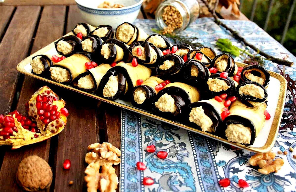 Безусловно, новогодний стол немыслим без традиционных блюд, о которых мы поговорили в предыдущей главе. И они непременно будут присутствовать на вашем столе — традиция есть традиция. Но, тем не менее, каждой хозяйке захочется приготовить что-то оригинальное, что запомнится гостям, порадует их своей необычностью и новым сочетанием вкусов. Рецепты таких оригинальных закусочных блюд предложены в этой главе. БАКЛАЖАНЫ С ОРЕХАМИ Продукты: Для начинки: Для украшения: зерна граната. Острым ножом нарезать баклажаны вдоль тонкими пластинами. Противень смазать растительным маслом, разложить баклажаны, посолить, сбрызнуть маслом и запекать приблизительно 10 мин. \ Приготовление начинки: порубить орехи, зелень, чеснок, смешать с майонезом. Можно все измельчить в блендере. Запеченные баклажаны остудить. Начинку выложить на полоски баклажанов, свернуть их в рулетики. Подавать, украсив зернами граната. ШАРИКИ ИЗ БАРАНИНЫ С ЗЕЛЕНЬЮ На 20 штук: Приготовление: Размочить булочку. Лук и чеснок нарезать