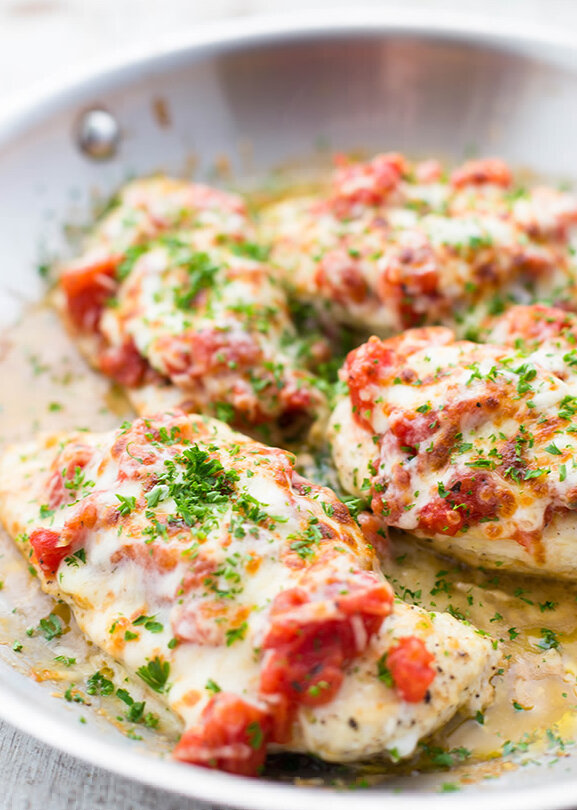 КУРИНЫЕ ГРУДКИ С СЫРОМ И ТОМАТНЫМ СОУСОМ. ИНГРЕДИЕНТЫ (НА 3 ПОРЦИИ): Ингредиенты: -3 куриных грудки; -150 г сыра моцарелла; -2 куриных яйца; -2-3 ст. л. муки; -панировочные сухари; -400 мл томатного соуса; -100 г сыра пармезан; -2 ст. л. свежего базилика; -соль по вкусу. Приготовление: -Разделочную доску присыпаем солью, обваливаем в ней грудки птицы и в каждой делаем надрез так, чтобы получился кармашек. -Моцареллу измельчаем на терке и заполняем кармашек, для надежности скрепляем зубочисткой. В глубокую мисочку вбиваем яйца, взбалтываем до однородности. Также подготовим еще 2 тарелки для муки и панировочных сухарей. -Теперь каждую грудку с сыром присыпаем мукой, затем окунаем в яичную смесь и панируем в сухарях. Чтобы панировка была достаточно плотной, повторяем процесс. -Куриное мясо обжариваем на сковороде до золотистости и перекладываем в форму. Заливаем грудки томатным соусом, присыпаем тертым пармезаном и отправляем в духовку на 20 минут, температура 180 °С. Для рецепта можно ис