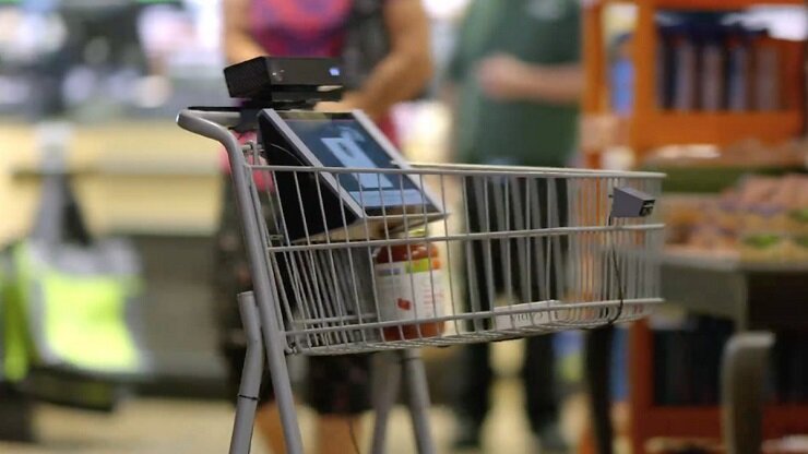 Холдинг «Росэлектроника» Госкорпорации Ростех создал комплексное решение «Умный магазин», основанное на технологиях RFID. Оно позволяет автоматически регистрировать все товары, которые покупатель берет с полки и кладет в тележку. Таким образом посетителю магазина не придется «пробивать» товары на кассе, чек будет формироваться автоматически, и его останется только оплатить. Использование новой технологии может уменьшить количество очередей и снизит время пребывания покупателей в магазине. Решение «Умный магазин» основано на применении RFID-технологии. Радиочастотные метки наносятся на товары, а магазинные полки и тележки оснащаются антеннами и RFID-ридерами. Таким образом, в информационную базу магазина моментально поступает информация о количестве проданного товара и остатке, а покупатель, сканируя покупки с помощью считывателя на «умной» тележке, экономит время при их оплате на кассе самообслуживания. Касса считывает данные о покупках с «умной» тележки, а также может ск