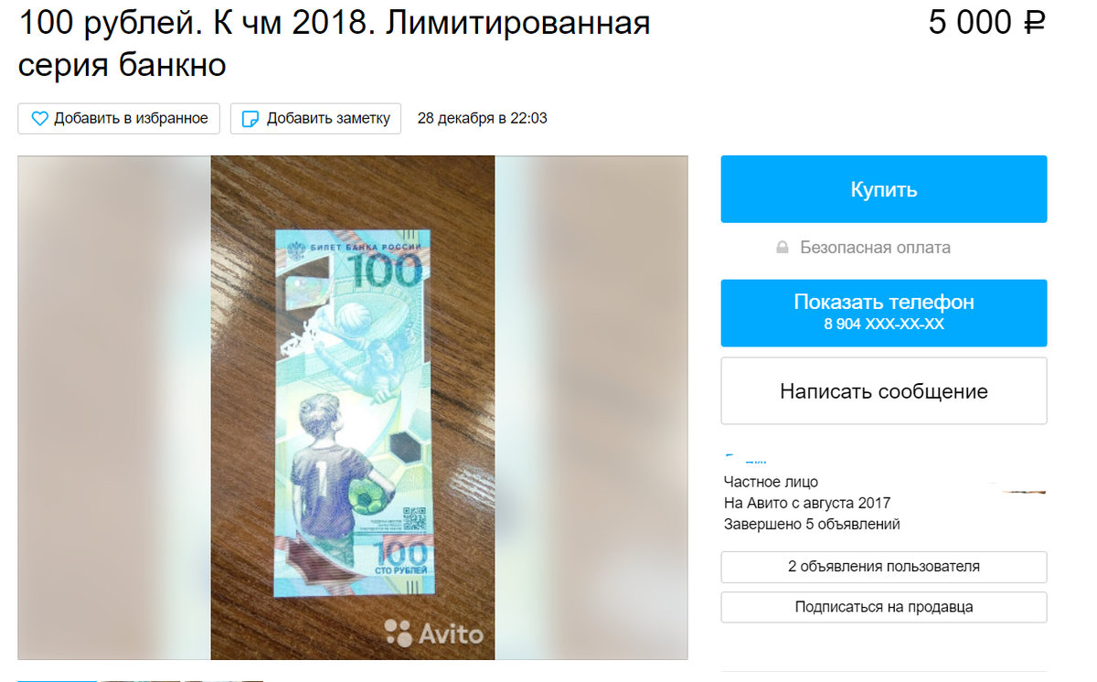 В итоге на сдачу в банке вы получите обычные сто рублей, а те необычные, что вам мог бы дать кассир, уйдут с авито с наценкой. По идее, службы безопасности банков должны следить за распределением средств, но особо никто внимания этому не придает. А вот ЦБ РФ, по информации Bankiros.ru, такие объявления отслеживает. Что случается с продавцами, которые "попались", история умалчивает.