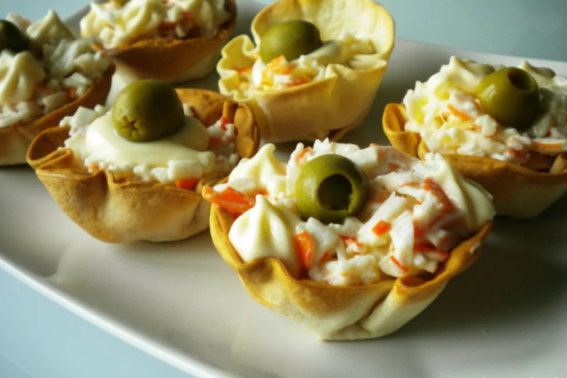 Рецепт в копилку новогоднего меню для худеющих: простая, но вкусная рыбная закуска Эта закуска очень вкусная ,легкая. Она красиво выглядит, готовится из доступных продуктов и не навредит вашей фигуре! Что нам понадобится: вафельные тарталетки; * крабовые палочки; консервированный тунец в собственном соку; немного репчатого лука; маслины по желанию; соль, сахарозаменитель, уксус. Вафельные тарталетки * смотрите рецепт здесь Как готовить: В качестве соуса в классическом рецепте используется майонез. Но наши тарталетки будут вкусными и без соуса, но если начинка покажется вам суховатой, то можно добавить в нее 1 вареный желток, предварительно растерев его вилкой. Количество ингредиентов зависит от кол-ва и размера тарталеток. Крабовых палочек и тунца должно быть примерно поровну, лука в 3 раза меньше. 1. Лук мелко нарежьте, залейте водой и добавьте щепотку соли, сахарозаменитель на кончике ножа и пол чайной ложки уксуса 9%. Попробуйте на вкус воду и по необходимости доба