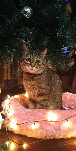 Привет. :З Совсем скоро новый год! Мои хозяева уже приготовились. И даже подарили мне красивую и мягкую подушечку, я валяюсь на ней в своем картонном домике. Я бы вам ее показал, но не в этот раз. :) Конфетки мне не дают. Мне нравится, как хрустят фантики, я облизываю их и гоняю по дому. Весь дом у нас украшен гирляндами, мишурой, шариками, наклейками и елочкой. Мне нравится. :З Хозяйка сказала, что этот новогодний вискас я получу на новый год. Жду. Желаю тебе хорошего нового года! Исполнения желаний, счастья, любви и мягких котиков. Мур :З А я займусь своим любимым делом, так время пролетит быстрее и наступит праздник! Скоро увидимся, не скучай, мур. :З