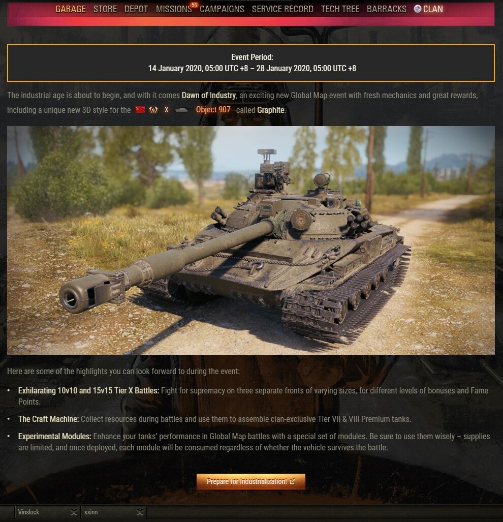 Предварительная слитая информация из западных азиатских Дискордов по поводу январского ивента на ГК World of Tanks: Период проведения события: 14 января 2020 года, 05:00 (UTC +8) — 28 января 2020 года, 05:00 (UTC +8).