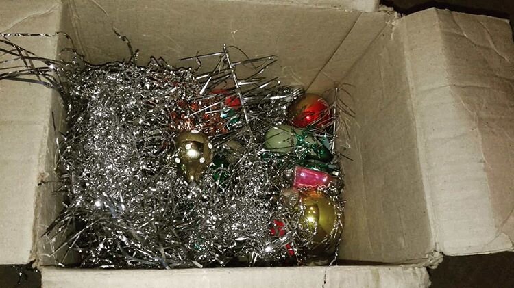 В доме кто-то выкинул коробку со старыми ёлочными игрушками. Разумеется, я не смогла пройти мимо, взяла коробку и начала извлекать игрушки. Сверху лежали спутанные дождик и мишура, поэтому игрушки доставались из глубины по одной. Честно, я уже думала, что кроме битых 2-ти рублёвых игрушек там и нет ничего. Но постепенно на свет извлекались интересные экземпляры. Так, например, нарисовалась