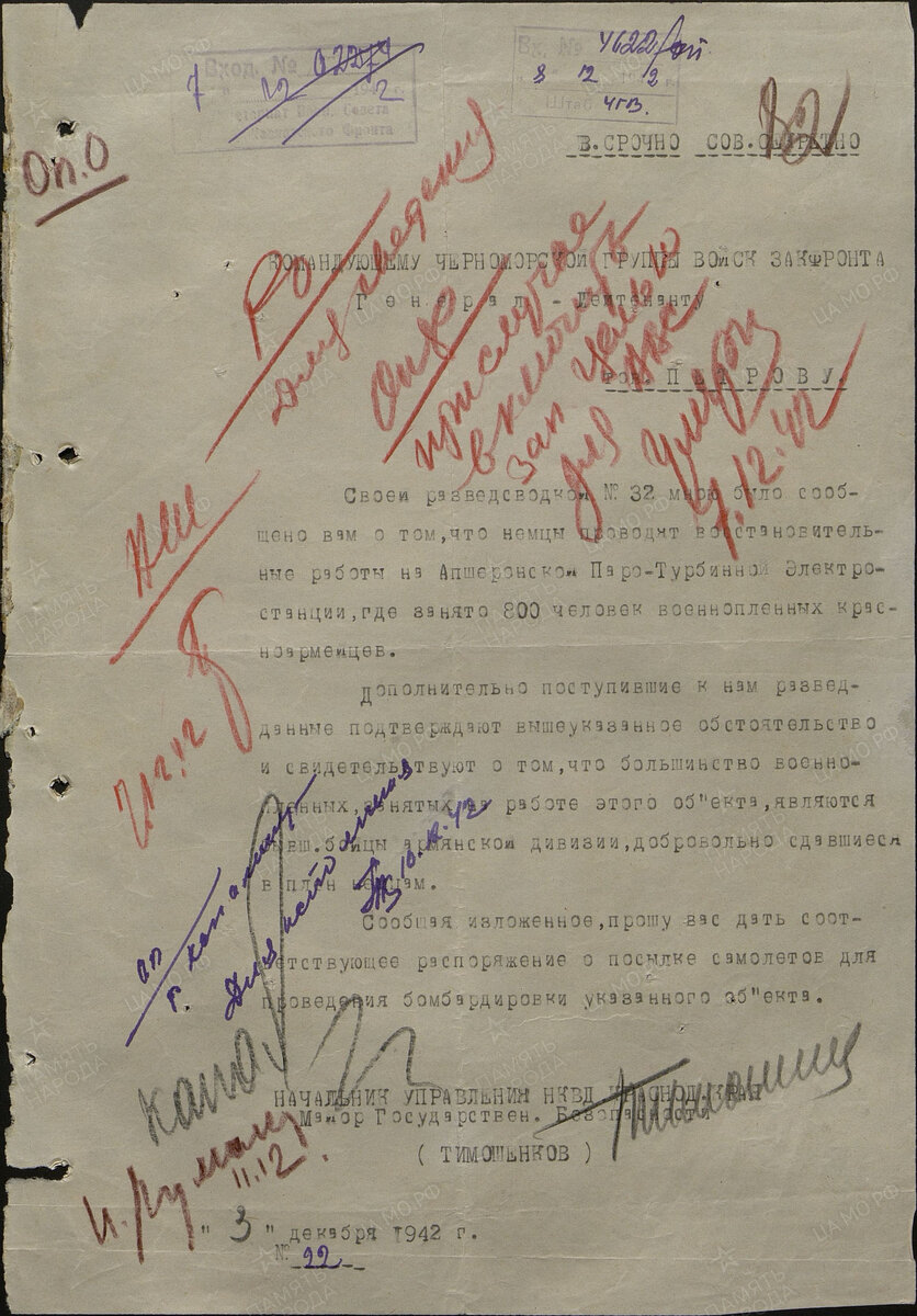 Дословно из рапорта « Своей разведсводкой №32 мною было сообщено вам о том, что немцы проводят восстановительные работы на Апшеронской Пара – Турбинной электростанции, где занято 800 человек военнопленных красноармейцев. Дополнительно поступившие к нам разведданые подтверждают вышеуказанное обстоятельство, и свидетельствует о том, что большинство военнопленных занятых на работе этого объекта, являются бывш. бойцы армянской дивизии, добровольно сдавшиеся в плен немцам. Сообщая изложенное, прошу вас дать соответствующее распоряжение о посылке самолетов для проведения бомбардировки указанного объекта ».