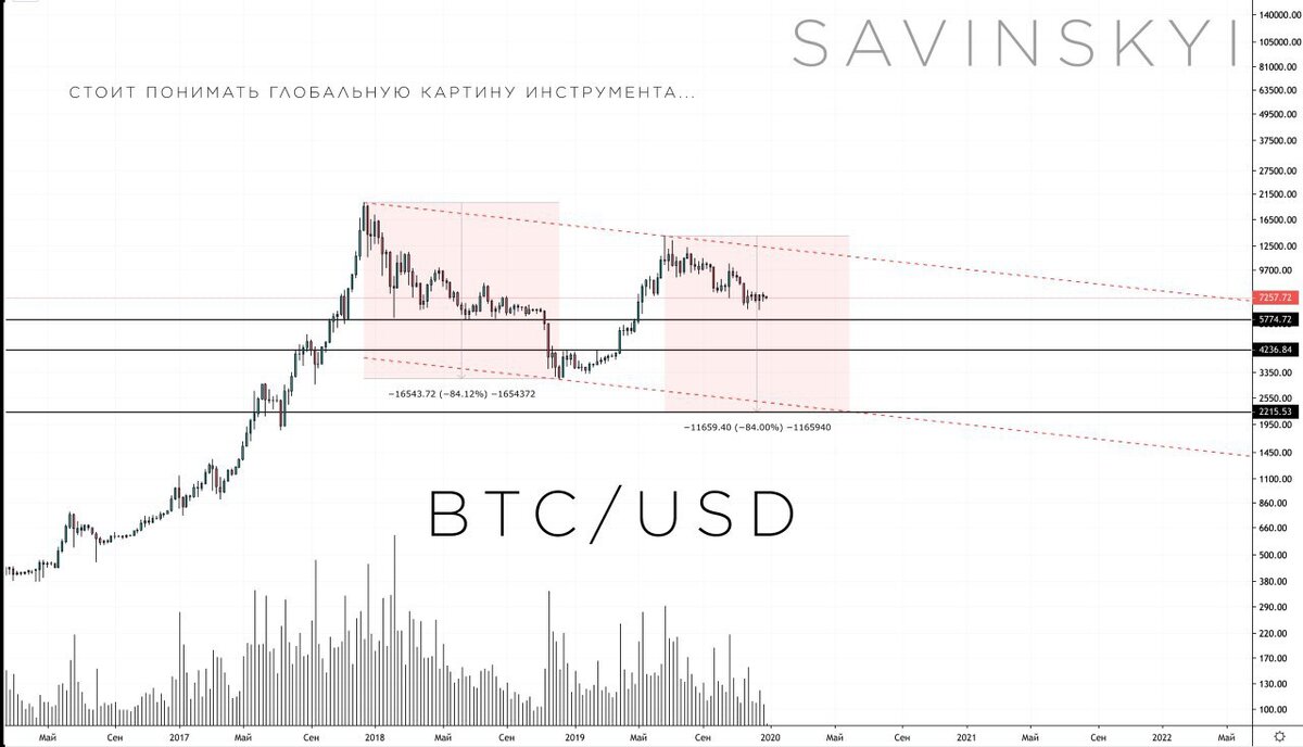 Сегодня рассмотрим еще несколько графиков "Глобальных" по BTC/USD И начнем с... BTC/USD глобальный нисходящий канал. На графике нисходящий канал, который показывает вероятность спуска Bitcoin к отметке 2215$ Это не говорит о том, что пора шортить, нет. Сейчас наоборот лучше рассмиатривать покупки. Просто имейте ввиду, и в случае чего мы вернемся к этому графику еще...