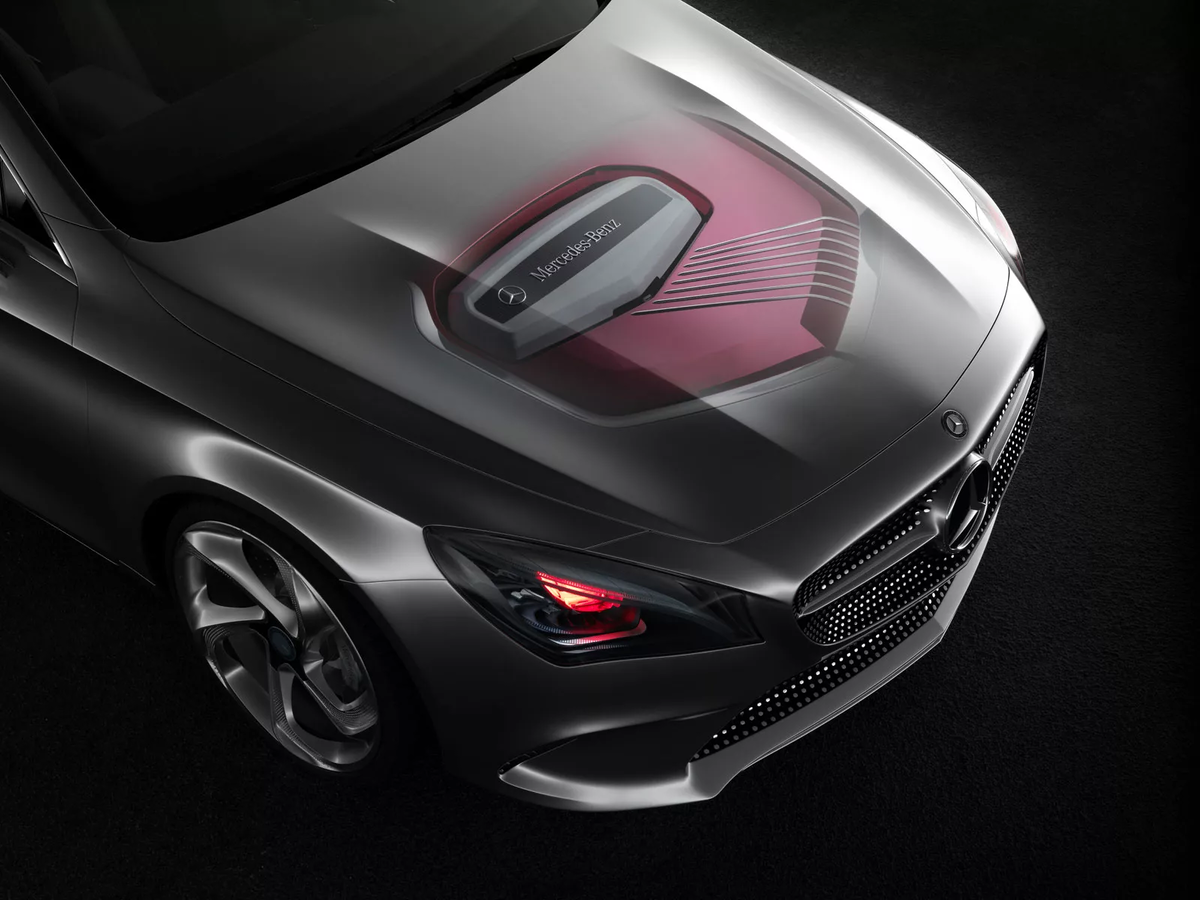 Особым стильным элементом концепта являются его высокотехнологичные фары. В режиме ожидания они светятся красным, а если включить указатель поворота, то по интегрированной волне пробегают световые импульсы. Дизайнерской находкой стали и филигранные наружные зеркала Mercedes CLA с интегрированными полосками повторителей поворотов.