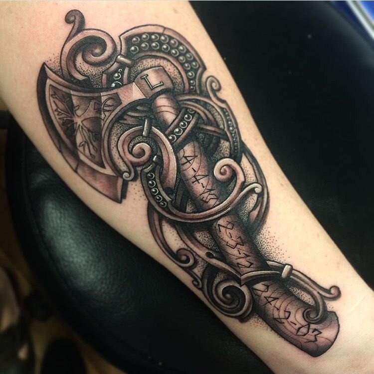 Топор - истинно мужская, древняя татуировка войнов. Топор как оружие весьма устрашающий и опасный, это же символика соответствует татуировке с его изображением. Тату с изображением топора ассоциируется с агрессией, с грубой мужской силой. Важный нюанс: у татуировки, на которых изображены топор-оружие и топор-орудие труда разные трактовки. Топор как оружие (например, стилизованный кельтский топор) - это неотвратимость возмездия, сила, потенциальное разрушение и ярость, воинственность. Топор как орудие труда – это помощь, знак готовности прийти на помощь в самых непростых жизненных ситуациях. Значение татуировки топор в восточной культуре – это символ отречения от мирских привязанностей. Поэтому часто встречается изображение топора, инкрустированного драгоценными камнями. Изображение топора в татуировках достаточно часто комбинируется с надписями, и тогда топор воспринимается как подтверждение серьезности слов. В портфолио именитых мастеров тату часто встречаются именно монохромные
