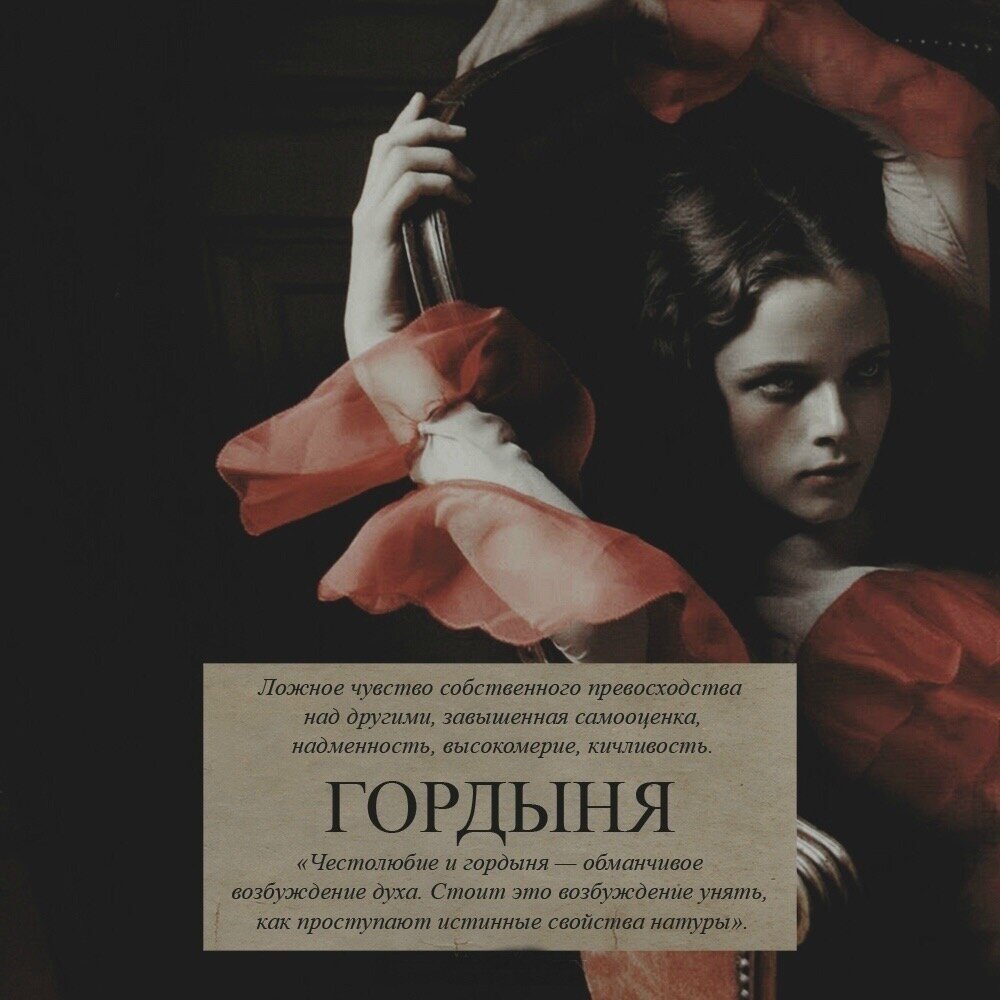 Гордость-самодовольное упоение собственными достоинствами, подлинными или мнимыми.Овладев человеком, она отсекает его сначала от людей малознакомых, потом — от родных и друзей. И наконец — от самого Бога. Никто не нужен гордому, даже восторг окружающих его не интересует, и лишь в себе самом он видит источник собственного счастья. Но как любой грех, гордость не приносит подлинной радости. Внутреннее противостояние всему и вся иссушает душу гордого человека, самодовольство, словно короста, покрывает ее грубым панцирем, под которым она мертвеет и становится неспособной к любви, дружбе и даже к простому искреннему общению.