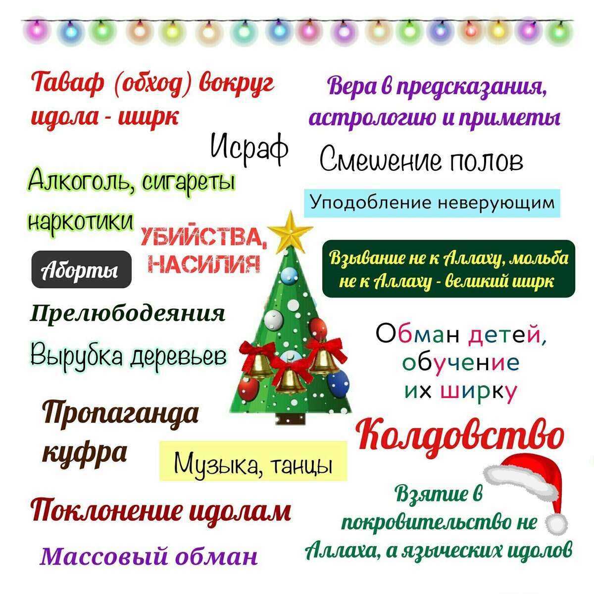 А) Таваф (обход) вокруг идола — ширк. Дети, которые пляшут вокруг елки, делают таваф вокруг нее, совершают старейший языческий обряд, который ненавистен Аллаху. Единственным узаконенным тавафом является обход Каабы во время Хаджа. Нельзя совершать ритуальный обход вокруг чего-либо, кроме Каабы. Аллах говорит в Коране: « … и пусть они совершают обход Древнего дома (т.е. Каабы) (сура «аль-Хадж», аят 29). Все остальные обходы, будь то обход могил, деревьев или новогодних елок — ширк и поклонение шайтану.