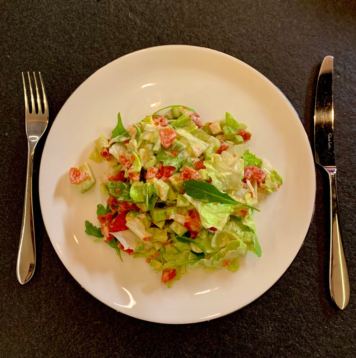 Дорогие друзья! Делюсь рецептом невероятно простого и вкусного салата из краба и овощей! Он понравится всем! 🔸Краб консервированный 1 банка (можно использовать замороженный или свежий, тогда ваша задача - его приготовить) 🔸Авокадо (лучше взять сорт хаас) - 2 штуки. 🔸Помидорки Черри 200 гр. 🔸Огурцы короткоплодные с мелкими семечками - 300гр 🔸Икра красная 2-3 ст.л. 🔸Салат айсберг или латук - небольшой велок. 🔸Салат руккола - по вкусу (немного). Майонез: 🔸1 яйцо 🔸100 мл растительного масла (лучше рафинированного) 🔸1 ст.л. лимонного сока 🔸горчица 1 ч.л. 🔸сахар 1 ч.л. 🔸соль по вкусу. Майонез: Ингредиенты должны быть комнатной температуры. Все загрузить в стаканчик, опустить блендер и взбивать несколько минут до уверенно густой консистенции. Далее отправляем в холодильник. Овощи: Авокадо почистить и нарезать кубиками 1 см Огурцы очистить от кожицы и нарезать кубиками 1 см Помидоры обдать кипятком (1 минута) и снять кожицу, далее нарезать кубиками 1 см. Лишнюю жидкость (а м