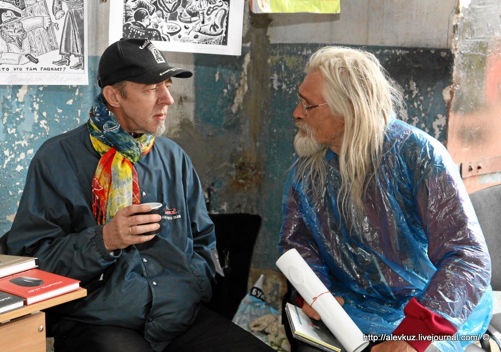 Две комнатки с общим душем и сортиром. По три кровати впритык в комнатках. Митя поселился с гипертоником. А я с алкоголиком. Солнце кувыркалось в небе. Было ощущение курорта. Вышли с Митей на балкон и задымили. Перед нами среди травы высилось недостроенная конструкция. - Что это? – сказал Митя и указал пальцем. Я посмотрел. Прямо под нашим балконом высилась вентиляционная шахта бомбоубежища. Таких в Ленинграде понастроили в 50-60-е прошлого века. А тут она торчала, считай, посреди леса. Поэт Сапега достал прибор и стал измерять давление. Прибор показал 200 на 100. Поэт Емелин вспомнил про водку, но не расстроился. Через час за нами приехали. Мы загрузили картины и покатили на зону. На обочине я увидел издалека выставленное табло со словом «Обмен». Интересно, какой у них курс валют? Когда проезжали мимо, то оказалось, что это забытое «Обмен баллонов». Оставался вопрос – на что меняют баллоны? Возле развалившейся конструкции промышленного типа стоял расписной шатер-пивная под названием «