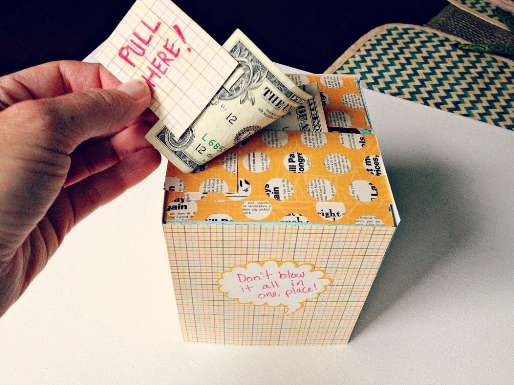 бывает что не успел купить подарок, что делать? - дарим деньги! 1.Разменяй купюру на самые мелкие бумажные "осигнации" которые сможешь по 50 руб, повезет то по 10 руб. Склей скотчем в одну полосу все купюры. Сматываем в рулон ( что б был рулон потолще п посолиднее)) возьми за основу картон или втулку от туалетной бумаги и на нее намотай деньги ) . Далее, если есть коробочка красивая , то на крышке или сбоку делаем ножом прорезь размером на пару миллиметров больше чем купюра. Приклеиваем стикер или бумажку на то м же скотче с надписью " тяни меня" - готово. если нет коробочки , то можно и в подарочный бумажный пакет положить рулон денег , но тогда заклеиь его сверху .. 2. Сгоняй в магазин и купи киндер сюрприз. Аккуратно раскрой .Очень аккуратно , говорю же) вытащи из яйца игрушку и вложи деньги. так же аккуратно склей шоколад и оберни как было . Подари, но проконтролируй , что б яйцо не передарил виновник торжества)) 3.Закинь купюру в обычный шарик. Лучше не прозврачный.